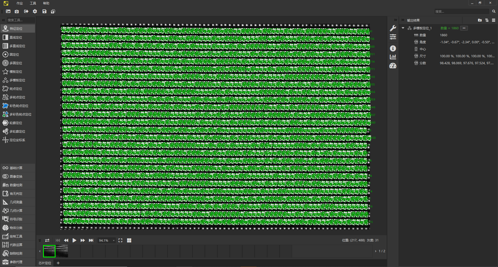 靈閃應(yīng)用結(jié)果:重復(fù)測(cè)量誤差最大0.08個(gè)像素,均值0.0197個(gè)像素,同時(shí)對(duì)近2000顆芯片進(jìn)行定位,耗時(shí)100ms
