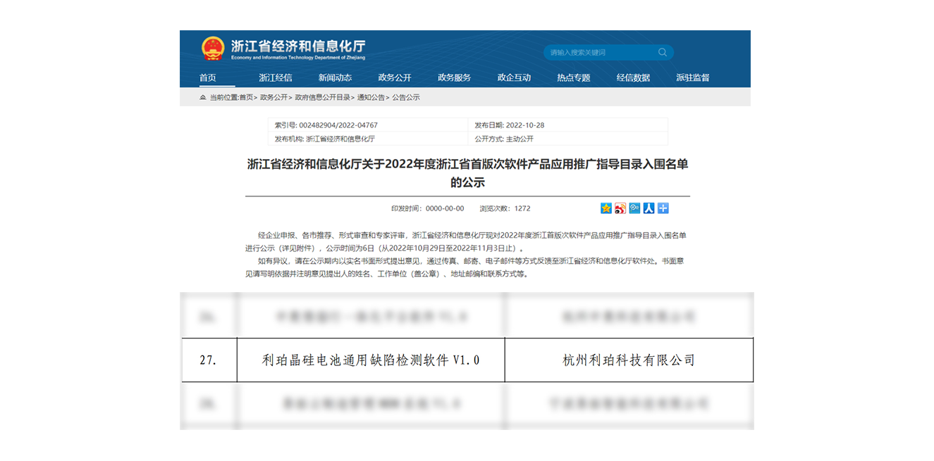 近日,浙江省經(jīng)濟(jì)和信息化廳公布了《2022年浙江省首版次軟件產(chǎn)品應(yīng)用推廣指導(dǎo)目錄》入圍名單,經(jīng)過多輪審查與專家評定,憑借行業(yè)領(lǐng)先的技術(shù)實力,杭州利珀科技有限公司憑借“晶硅電池通用缺陷檢測軟件 V1.0”成功入選。