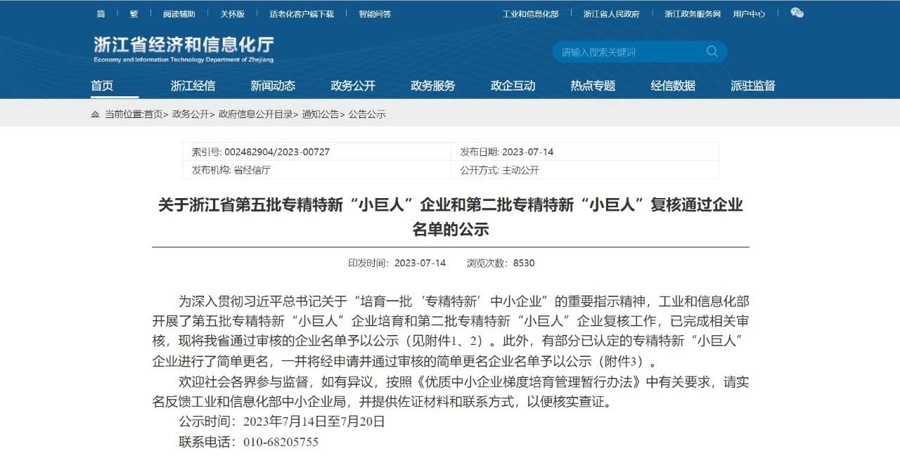 2023年7月,浙江省第五批專精特新“小巨人”企業(yè)名單正式公式,利珀科技通過層層嚴(yán)格評審,憑借優(yōu)異的技術(shù)創(chuàng)新能力、突出的成長速度和廣闊的發(fā)展前景入選該名單,榮獲國家級專精特新“小巨人”企業(yè)稱號。