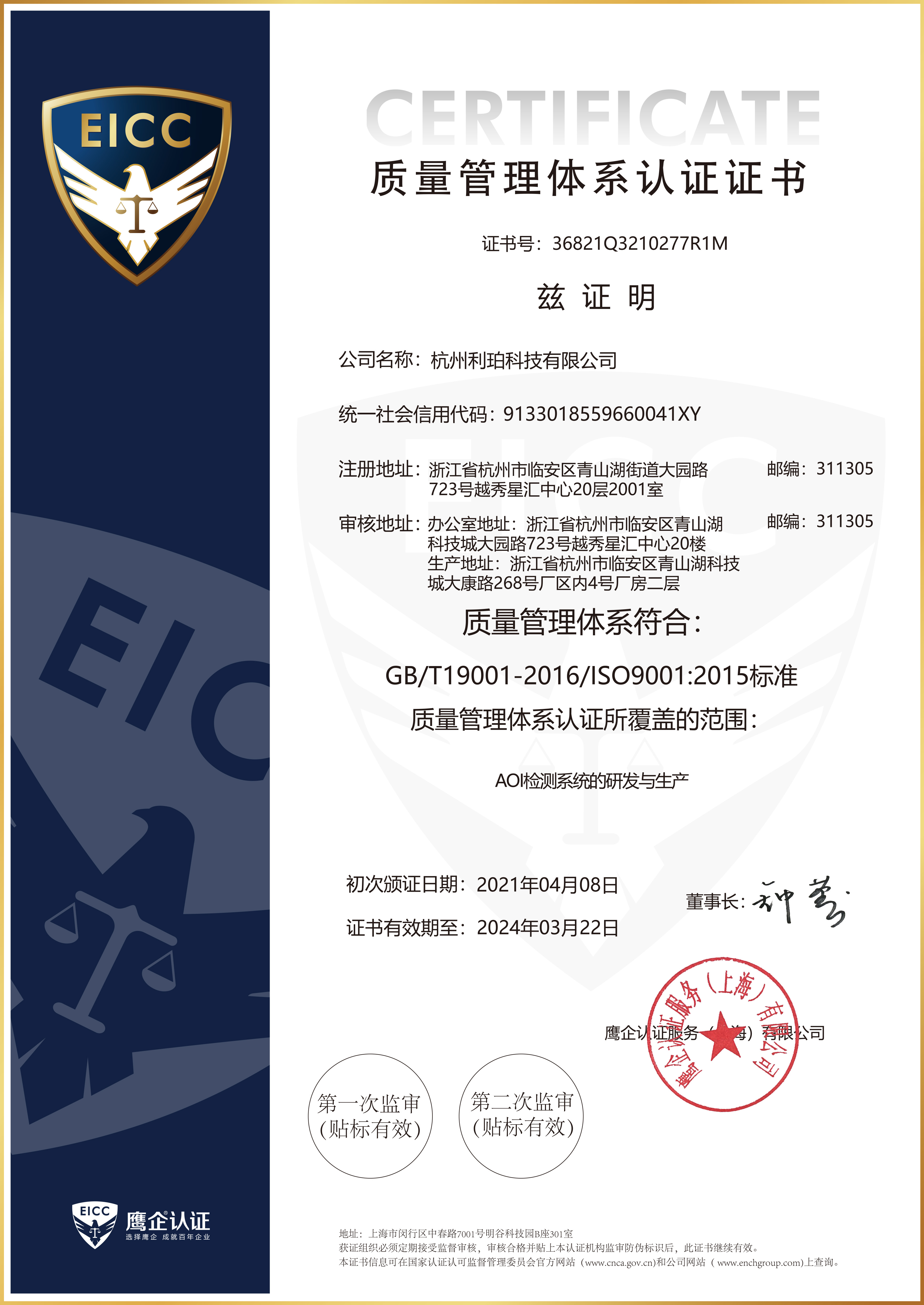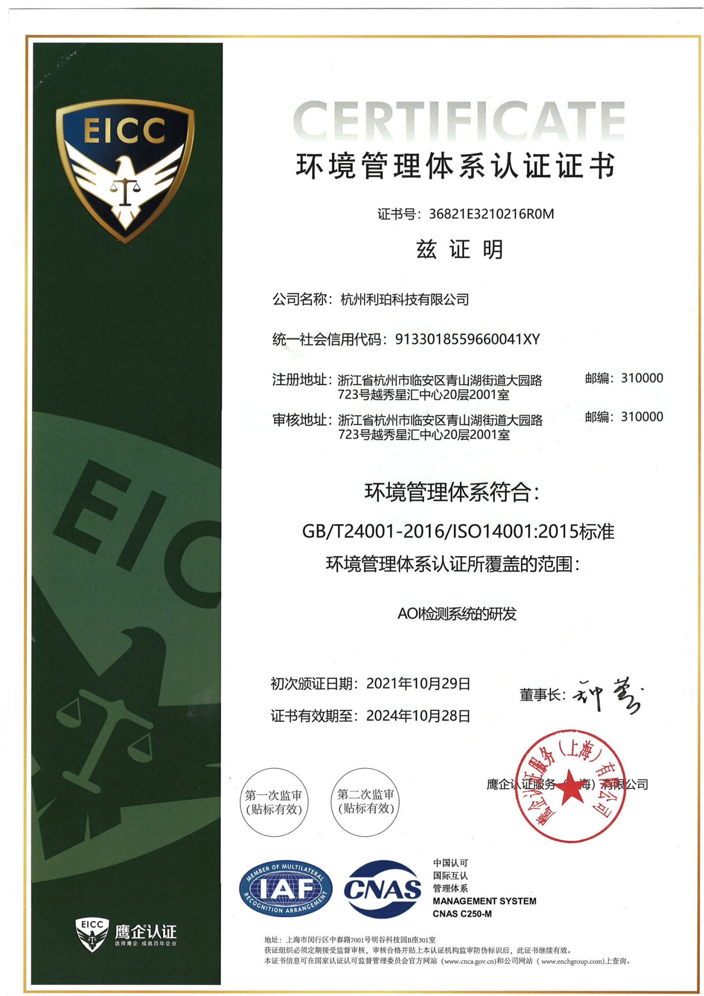 環(huán)境管理體系認證證書