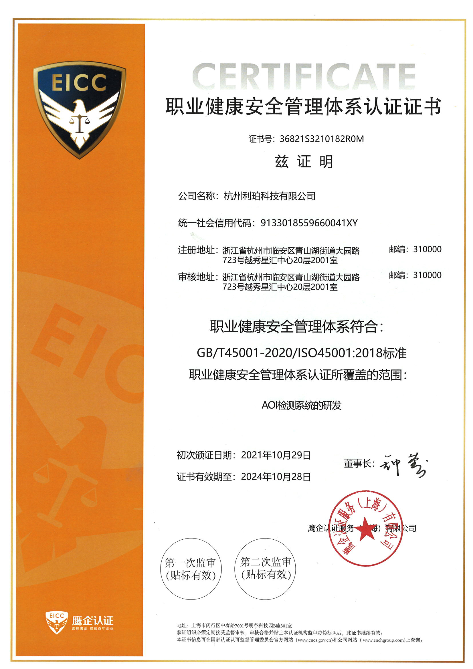 職業(yè)健康安全管理體系認證證書